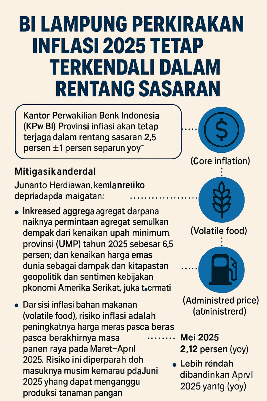 Kepala KPw BI Provinsi Lampung, Junanto Herdiawan, dalam keterangannya menyampaikan bahwa meskipun inflasi diperkirakan tetap terkendali, sejumlah risiko eksternal maupun internal perlu diwaspadai dan dimitigasi.