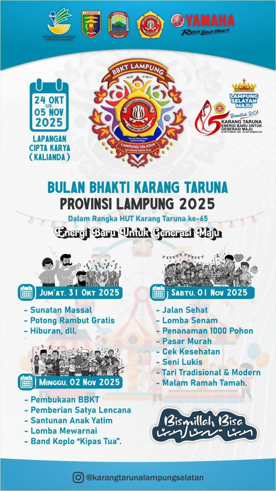 Pramoedya.id: Kabupaten Lampung Selatan resmi ditunjuk sebagai tuan rumah pelaksanaan Bulan Bakti Karang Taruna (BBKT) Provinsi Lampung sekaligus peringatan Hari Ulang Tahun (HUT) Karang Taruna ke-65. Agenda ini akan berlangsung pada 24 Oktober hingga 5 November 2025 dan diikuti seluruh pengurus Karang Taruna dari kabupaten/kota se-Lampung.