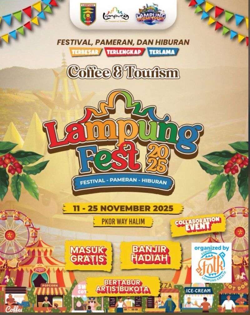 Pramoedya.id: Lampung Fest akan hadir pada 11–25 November 2025 di PKOR Way Halim, Bandar Lampung. Berbeda dengan festival sebelumnya, hajatan ini dirancang sebagai panggung kolaborasi masyarakat, komunitas kreatif, dan dunia usaha untuk menggerakkan pariwisata daerah. Lebih menarik lagi, penyelenggaraan festival sama sekali tidak menggunakan dana APBD.