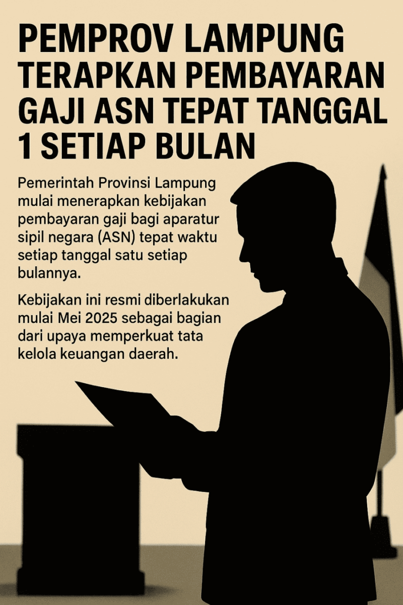 Pramoedya.id: Pemerintah Provinsi (Pemprov) Lampung mulai menerapkan kebijakan pembayaran gaji bagi aparatur sipil negara (ASN) tepat waktu setiap tanggal satu setiap bulannya. Kebijakan ini resmi diberlakukan mulai Mei 2025 sebagai bagian dari upaya memperkuat tata kelola keuangan daerah.