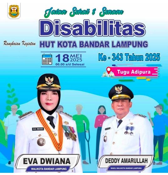 Pramoedya.id: Pemerintah Kota Bandar Lampung akan menggelar jalan sehat dan senam disabilitas dalam rangka memperingati HUT ke-343 Kota Bandar Lampung. Acara akan dipusatkan di Tugu Adipura pada Minggu (18/5/2025).