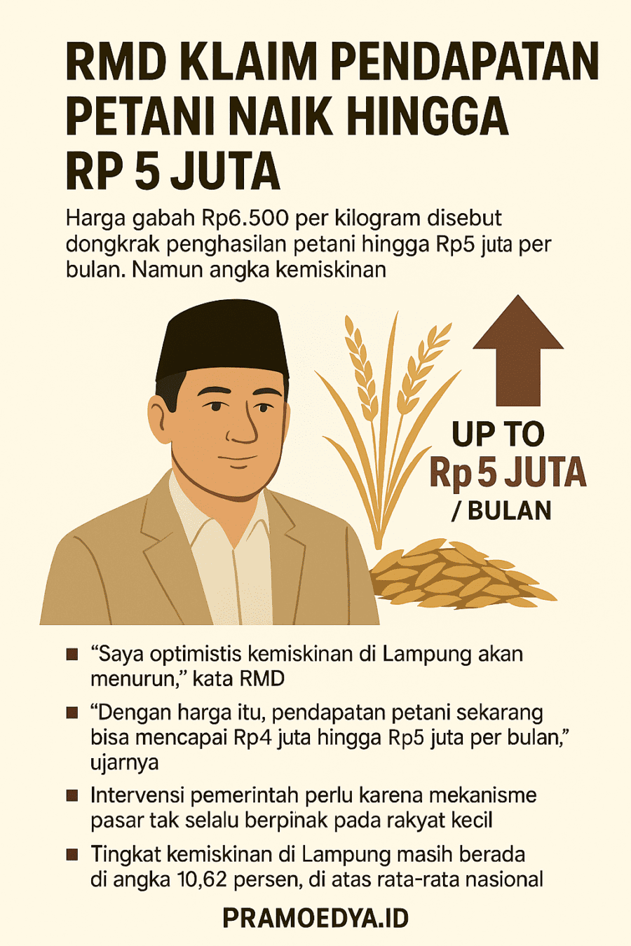 Pramoedya.id: Gubernur Lampung, Rahmat Mirzani Djausal (RMD), menyebut program pemerintah yang langsung menyentuh masyarakat, khususnya di sektor pertanian, menjadi kunci dalam menurunkan tingkat kemiskinan di provinsinya.